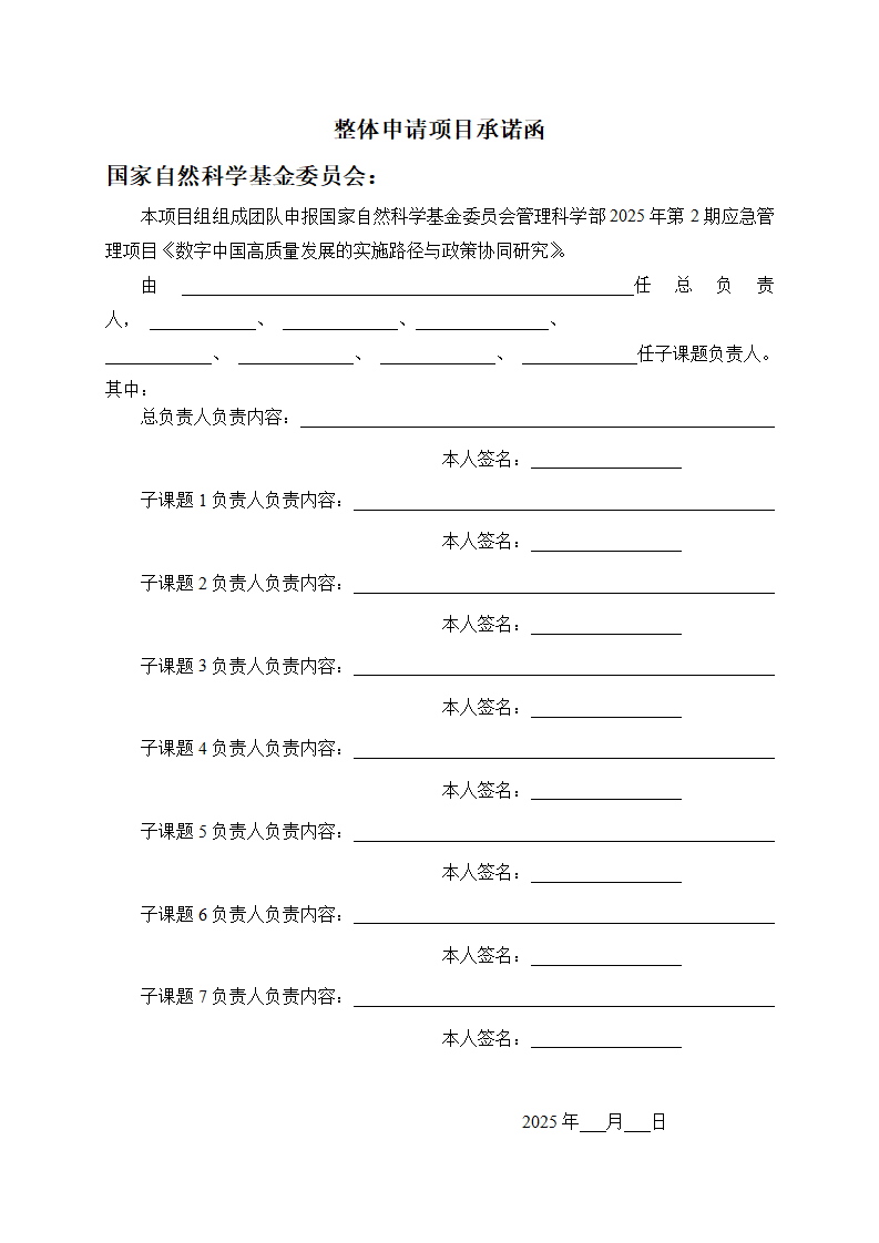 2.?鼓勵并優先資助團隊整體申請本項目。要求申請人將本項目作為一個整體來申請,其中包含1個總課題和7個子課題,并分別提交項目總體申請書和各子課題申請書,在研究內容中應明確說明本課題與其它相關課題之間的關系,加強各課題之間的合作。總項目負責人需在申請書中介紹子課題分工情況,并附上“整體申請項目承諾函”(附件),子課題無需提供承諾函。對不能組織團隊整體申請,但對某一子課題確有研究優勢的單份申請也有可能獲得資助,該申請獲準立項后申請人將歸入整個項目團隊。