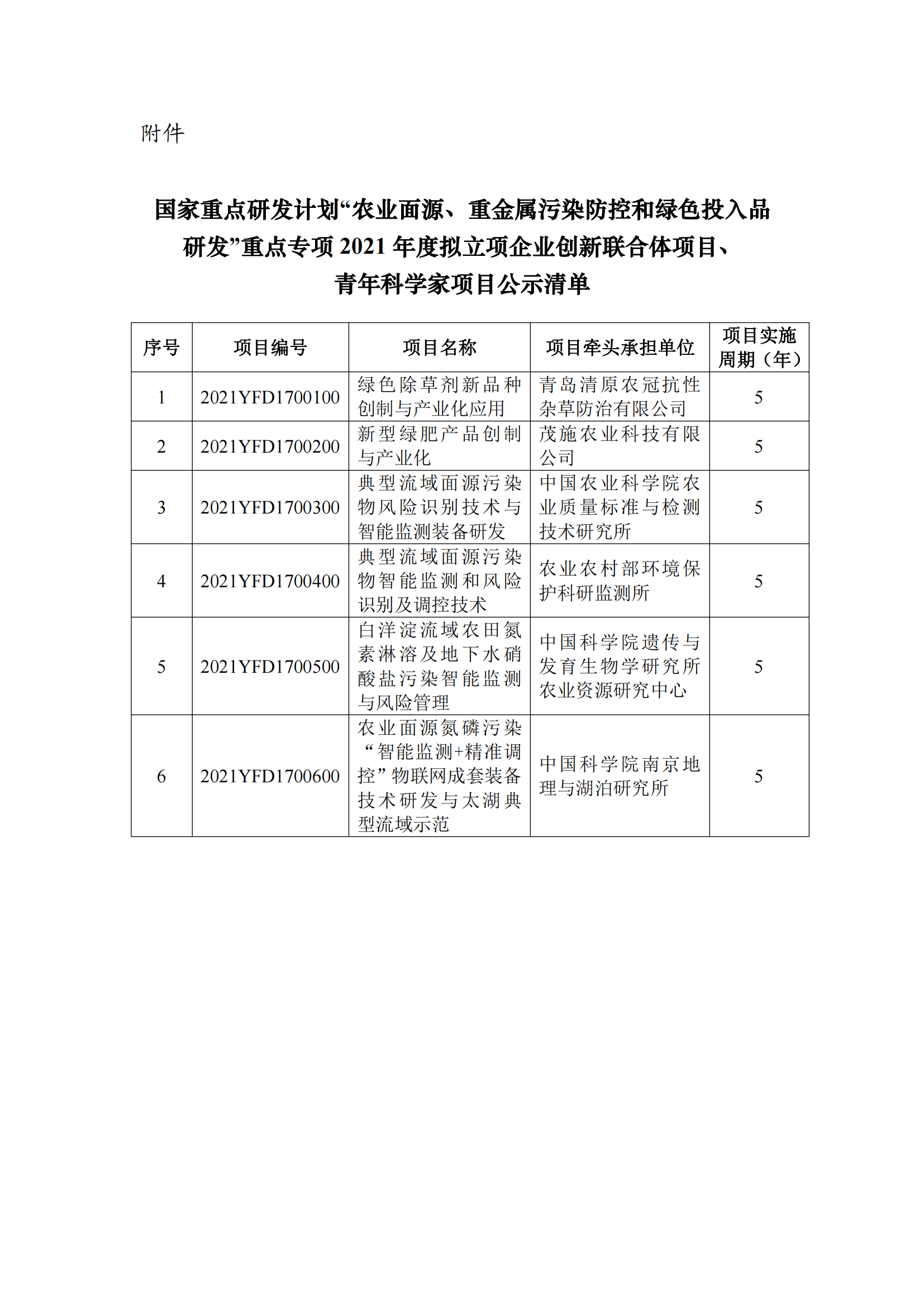 關于國家重點研發計劃“農業面源、重金屬污染防控和綠色投入品研發”重點專項2021年度擬立項企業創新聯合體項目、青年科學家項目安排公示的通知