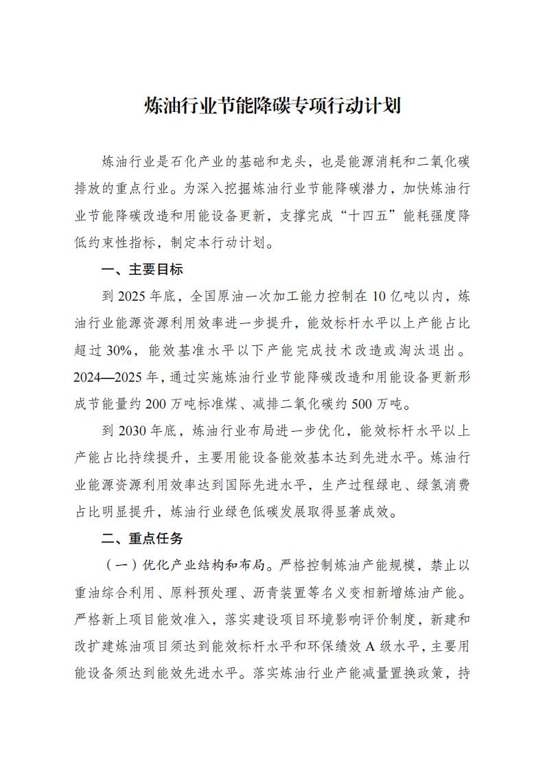 國家發(fā)改委等五部門關(guān)于印發(fā) 《煉油行業(yè)節(jié)能降碳專項行動計劃》的通知