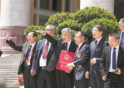 6月24日上午,全國科技大會、國家科學技術獎勵大會、兩院院士大會在京召開。圖為獲獎人員在人民大會堂前合影留念。