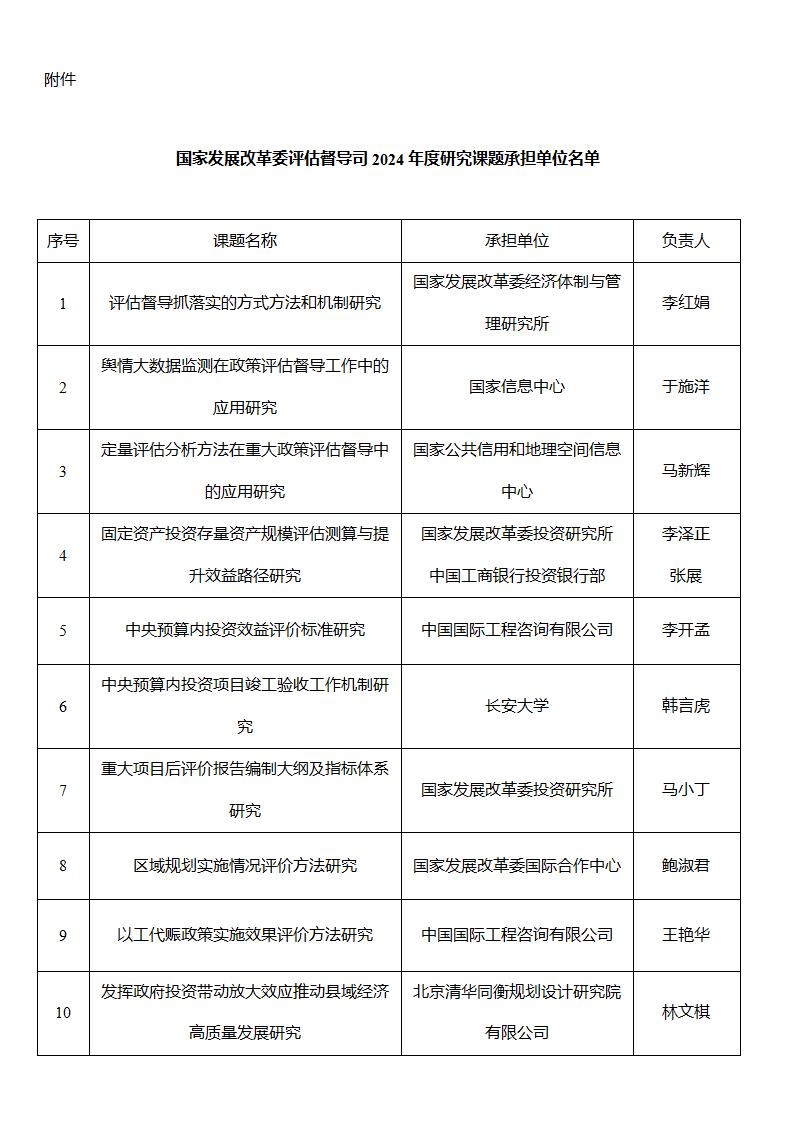 附件:國(guó)家發(fā)展改革委評(píng)估督導(dǎo)司2024年度研究課題承擔(dān)單位名單