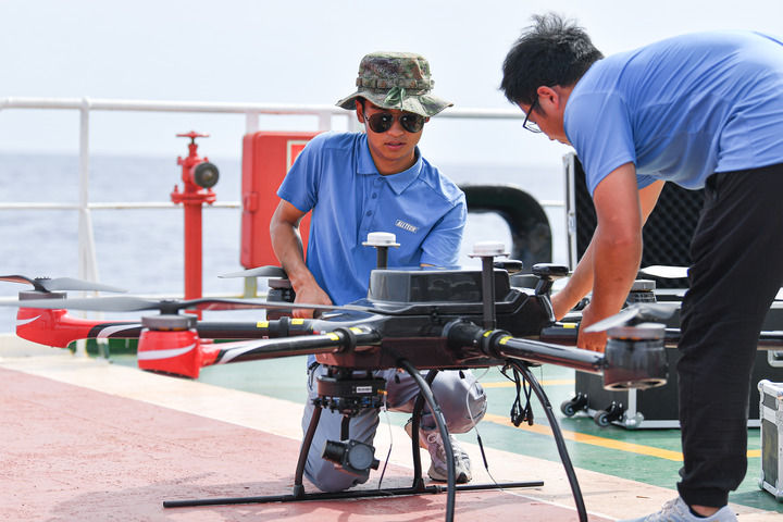 ??工作人員在“電科1號(hào)”綜合試驗(yàn)船上調(diào)試無人機(jī)(2023年6月15日攝)。新華社記者 蒲曉旭 攝